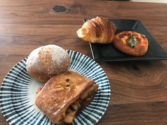 左から、ごまパン、春菊と筍、クロワッサン、マルゲリータ